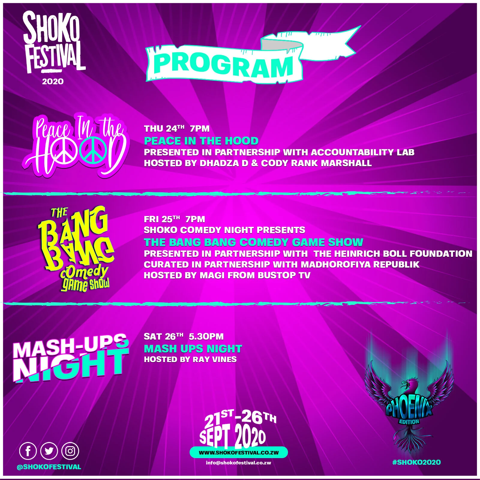 Shoko Festival is Zimbabwe’s most popular and longest-running urban culture festival. Shoko is all about promoting urban culture, free expression and new ideas. Over the years the festival has provided a platform for hundreds of young Zimbabwean rappers, comedians, musicians and spoken word artists to perform, collaborate and express themselves. Shoko also curates cutting edge collaborations between local and international acts and builds international tours for young Zimbabwean artists.